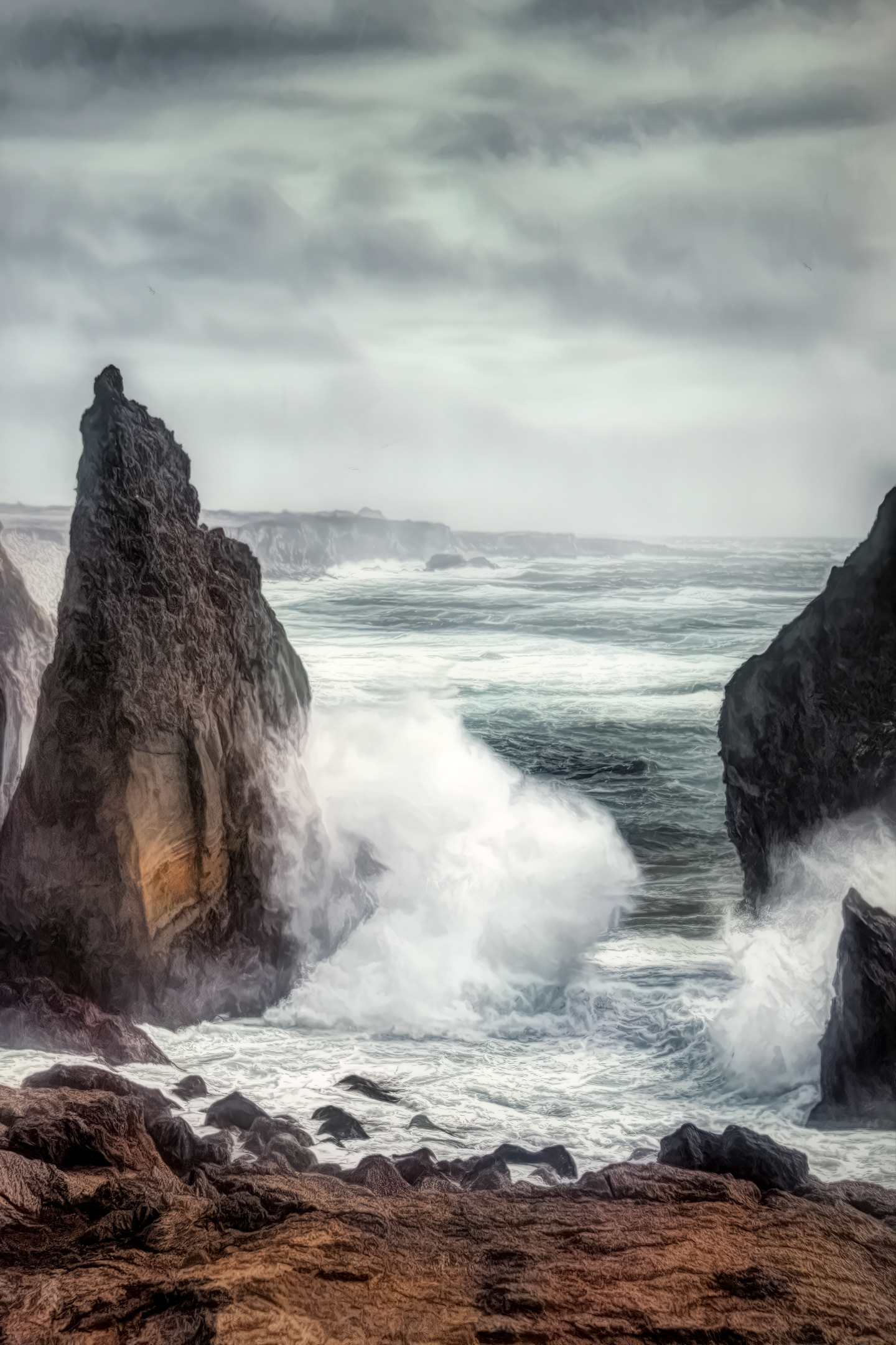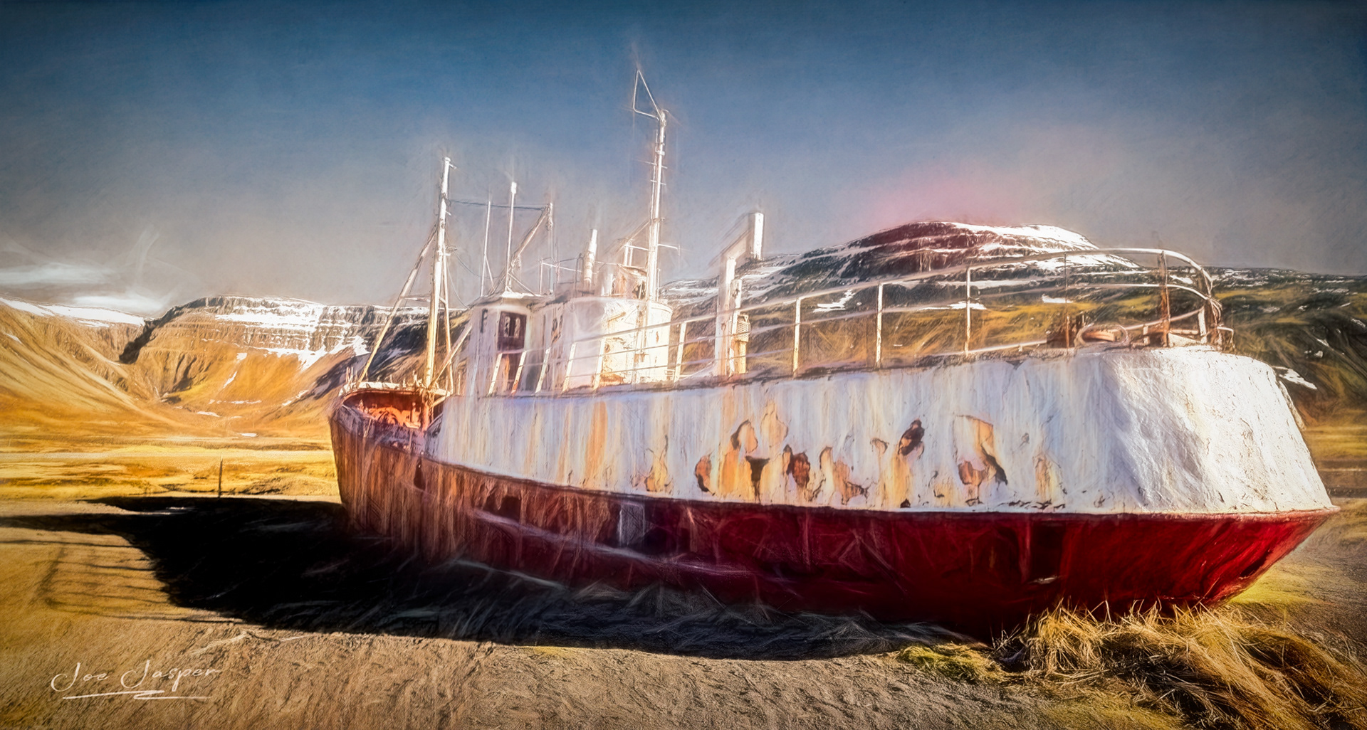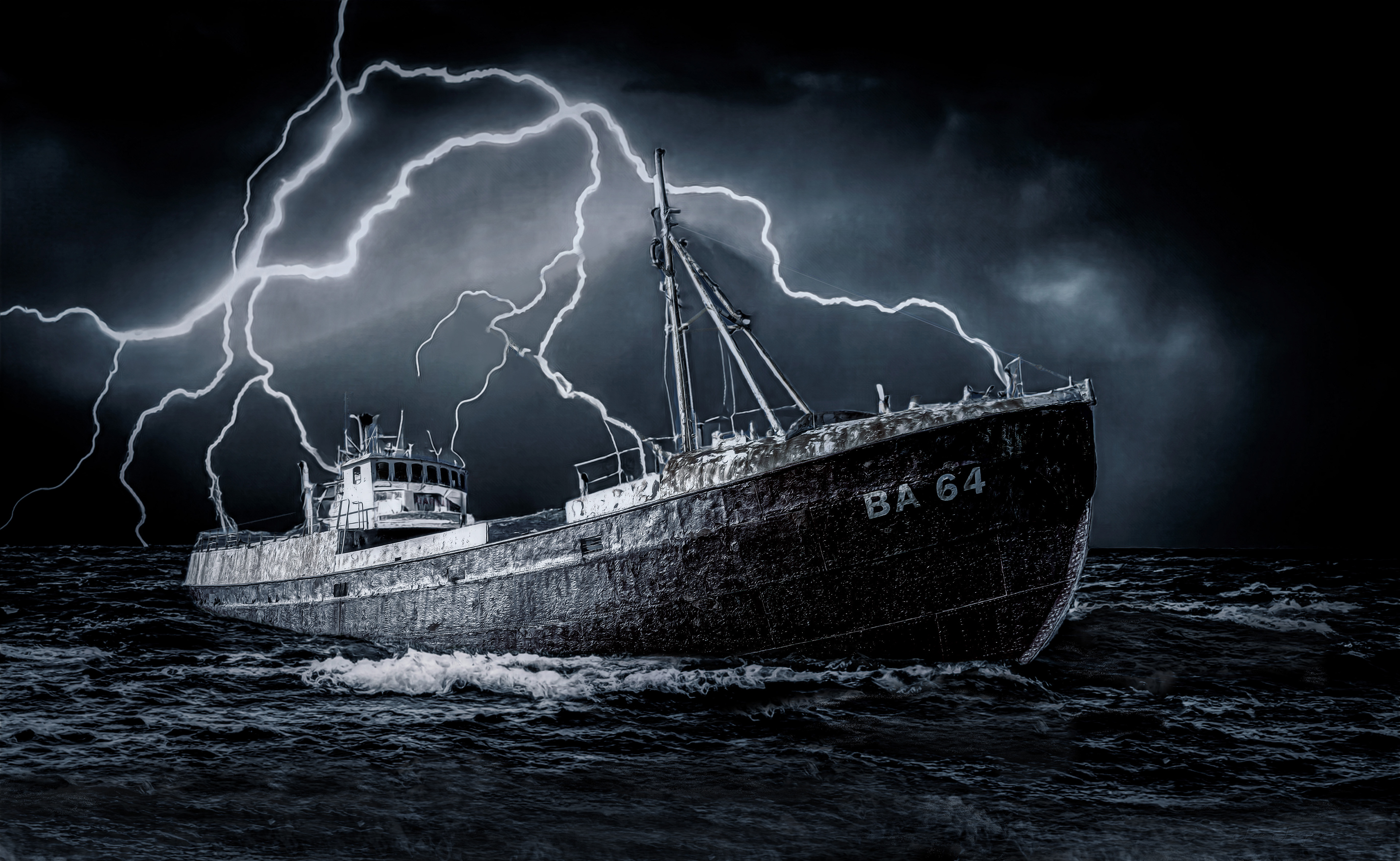 Shipwrecked ship with AI generated sea, sky and lightening.